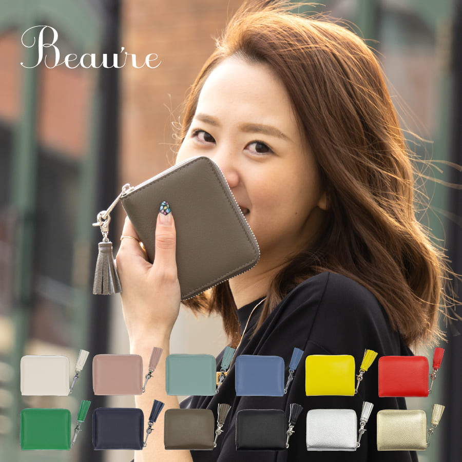 【母の日ラッピング無料】 BEAURE/ビュレ 牛革 二つ折り財布 日本製 本革 ラウンドファスナー タッセル付き レディース [全12色] [BS30062]レザー 女性 財布 コンパクト財布 ギフト シルバー ゴールド イエロー グリーン グレージュ ピンク ブルー ブラック